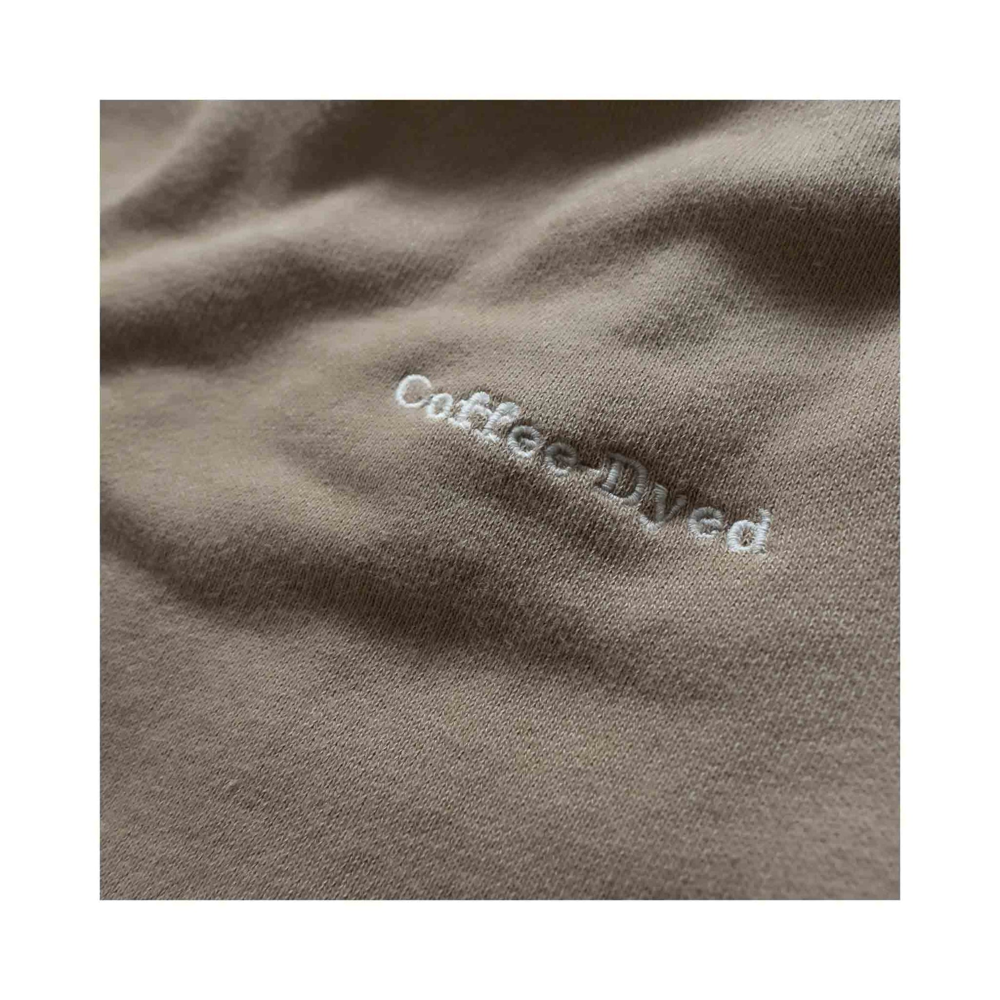 コーヒーが好きで、ある日自分で挽いたコーヒーを白いTシャツこぼしてしまい、なかなかシミが取れなかった。じゃあコーヒーでわざと染めてみるのはどうか?と思い試作した所、かなりカッコいい色味になった事がデザインのきっかけです。